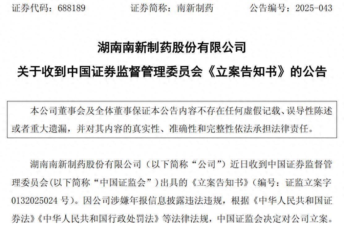 9月30日晚间,南新制药(688189)发布公告称,公司近日收到中国证监会出具的《立案告知书》。因公司涉嫌年报信息披露违法违规,中国证监会决定对公司立案。