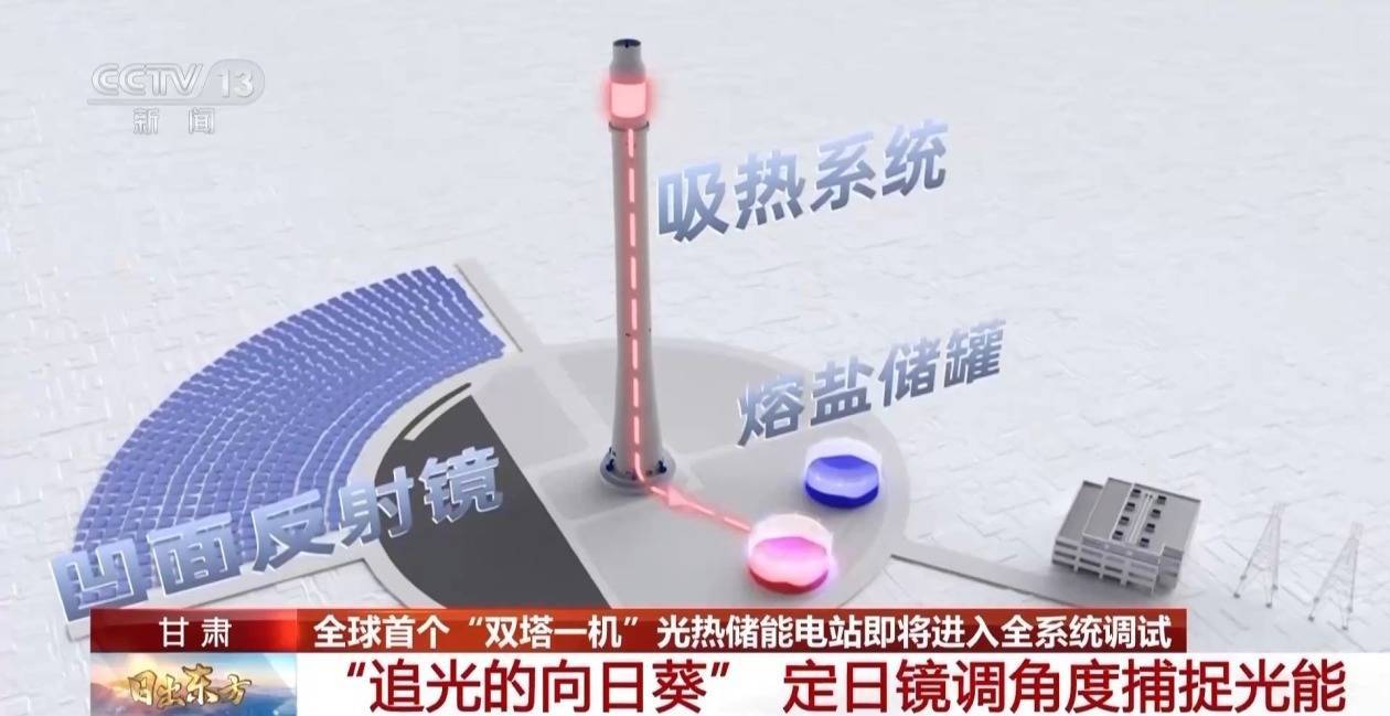 r全球首个“双塔一机”光热储能电站在甘肃酒泉瓜州。千百年来,西北地区风、日之暴烈,是边塞诗歌中的重要元素。如今两座集热塔矗立于大漠戈壁之上,两万多定日镜如涟漪般围绕,将茫茫戈壁变成了绿潮涌动的能源新高地。