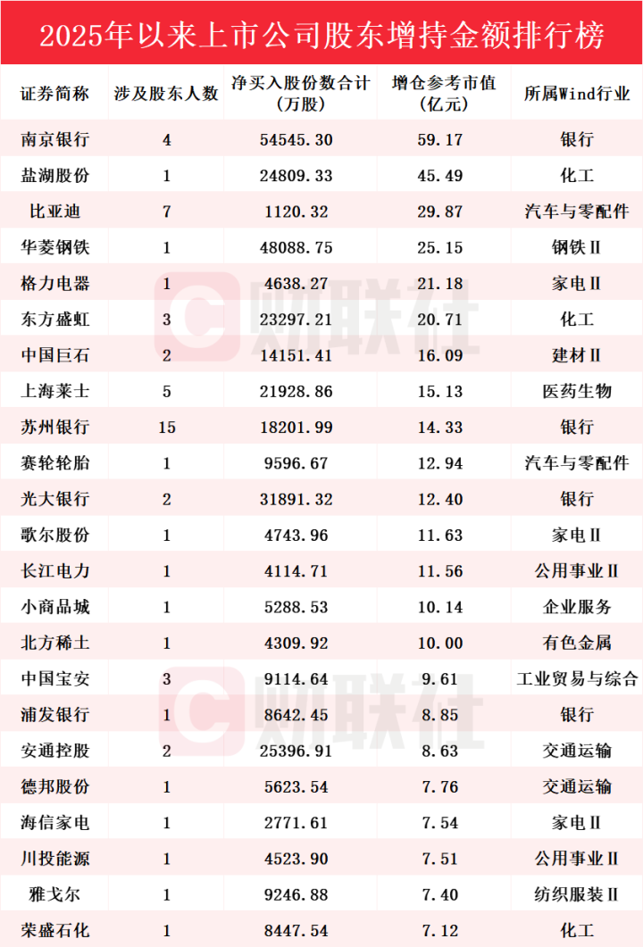 从上市公司股东增持的金额来看,有14家公司股东增持金额超过10亿元,具体为南京银行、盐湖股份、比亚迪、华菱钢铁、格力电器、东方盛虹、中国巨石、上海莱士、苏州银行、赛轮轮胎、光大银行、歌尔股份、长江电力和小商品城。其中,南京银行股东增持额位居榜首,金额为59.14亿元;盐湖股份、比亚迪股东增持额分别为45.49亿元、29.87亿元,位列第二和第三。具体情况详见下图: