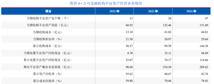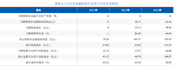 陕西金资加快了处置进度,2024年处置回收现金44.5亿元,同比增长26.72%。累计资产回收率和累计成本回现率均较上年末有所上升,现金回收情况较好。此外,陕西金资还拓展了个贷不良业务,但规模较小。